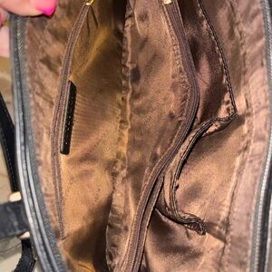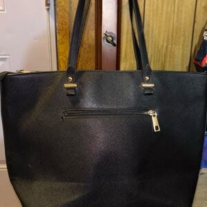 This elegant black tote bag is perfect for any occasion. OUTSIDE: small logo on front and zipper pocket on back side. INSIDE: A middle pocket divider with 2 pockets on one side and a zipper pocket on the other side. I put my 40 oz meoky in it and still plenty of room(just for show on size: it’s big). DOESN’T SUPPORT WATER BOTTLE UNLESS SPILL PROOF . Its old hardware is scratched but its sill in good condition originally from amazon was a 3 set the other 2 pieces are gone(broken).