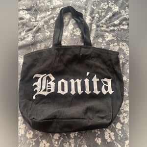 Stylish black tote bag featuring 'Bonita' in bold white letters. Perfect for everyday use.