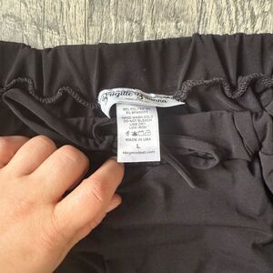 These black track pants feature a comfortable elastic waistband with a drawstring for an adjustable fit. Made from a soft and slightly textured fabric, they offer a loose fit with gathered elastic cuffs at the ankles for a stylish look.