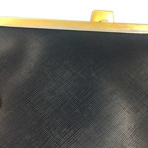 Feature: Gold Tone Chain Handle, Strap Drop 5”. Clutch Lock Clasp. Interior Pocket
