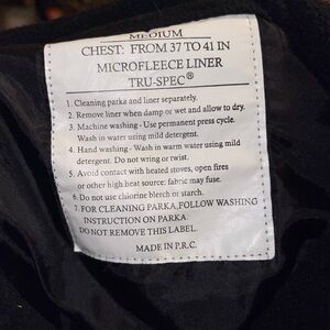 Tru Spec black micro fleece lined parka long sleeve zip up moisture wicking jacket with bottom side zippers and zippered pockets. Elastic cuffed banded sleeve. Comfy parka specifically made to combat the harsh weather, this men's apparel can also be used for athletic or a daily wear