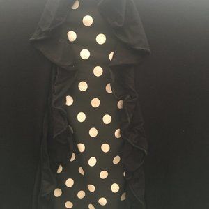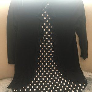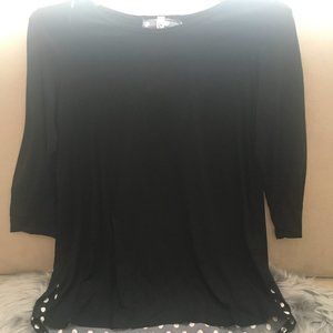 3/4 sleeve Black T-shirt. The back is also black but with the added interest of a ruffle detail and black and white polka dot inset on the back with a rounded bottom. The back is longer than the front. Put on with a pair of skinny jeans and you have a easy outfit.