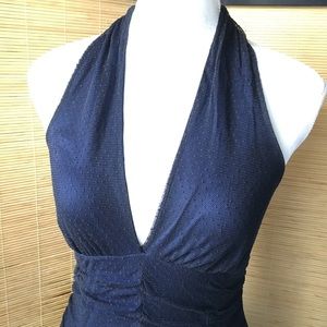 This chic halter dress by Jasmine Sola features a black tulle with small polka dot design over a dark navy lining. Tie halter in the back. Stretch material provides easy slip-on for various body types. Gently worn in excellent condition without any signs of wear.
