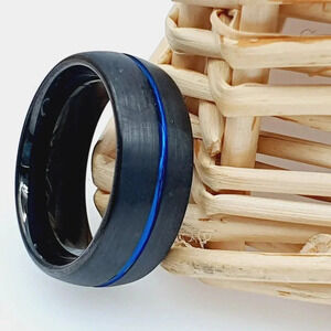 Black Tungsten Ring With Blue Line Inlay, Mens Engagement Ring, Brushed Black Tungsten, Matte Black Ring, 8MM Wedding Band, Ring For Husband
