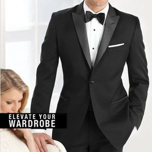 Black Tuxedo Jacket size 36R, very gently used, like new condition satin shiny notched lapel with 2 buttons in the front