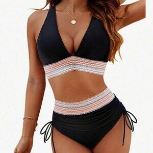 This is the viral bikini you’ve seen everywhere—flattering, fun, and stylish. With its chic black base and colorful chevron waistband, it offers the perfect mix of coverage and curve-hugging design. The halter-style top gives support with a plunging neckline, while the high-waisted bottoms feature ruched sides and adjustable ties for the fit you want.