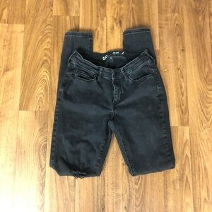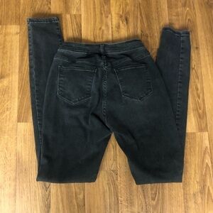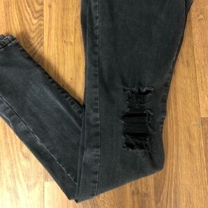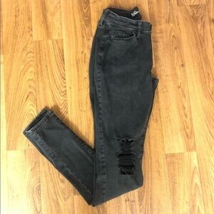 A very stretchy pair of black jeans with a hole on the right knee. The “curvy skinny” style is flattering and sexy. Pair with boots this fall season!