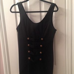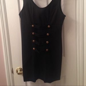 black semi-fired dress with gold decorative buttons on front, stretchy, slip on