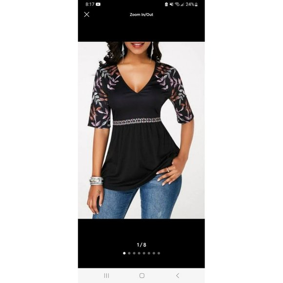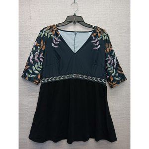 Black V Neck Blouse with Leaves Pattern and Half Sleeve Size Large