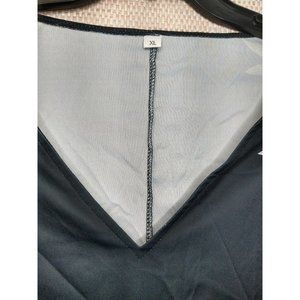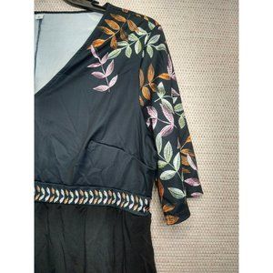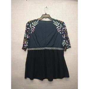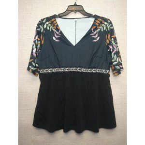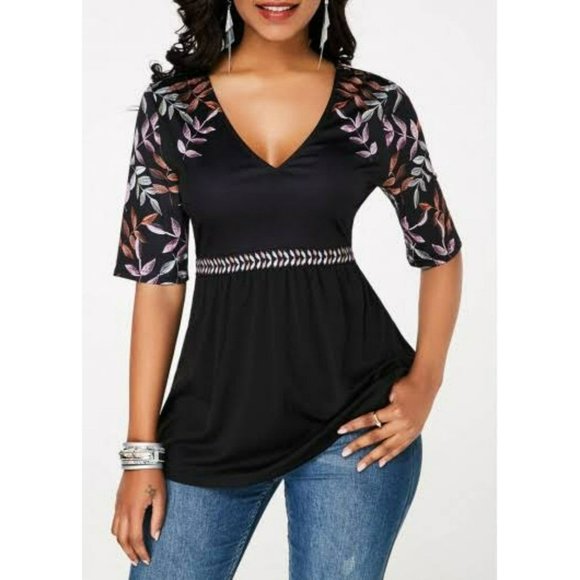 Black V Neck Blouse with Leaves Pattern and Half Sleeve Size XL