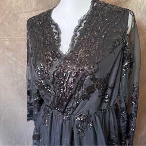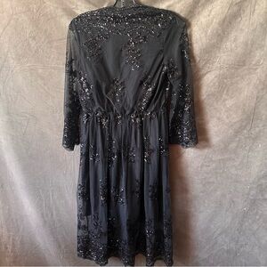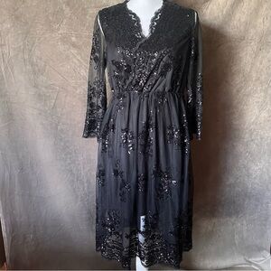 Black V-Neck Cocktail Dress with Lace and Sequined Floral Embellishments