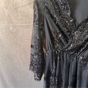 Elegant A-line silhouette with V-neck and sequined embellishments.