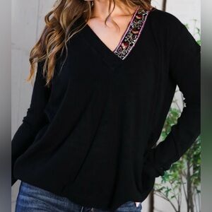 This black long-sleeve sweater features a flattering V-neckline accented with gorgeous sequined trim in pink, red, and metallic colors. Relaxed fit makes it perfect for pairing with jeans or leggings, while the unique neckline adds a pop of style to a classic wardrobe staple.