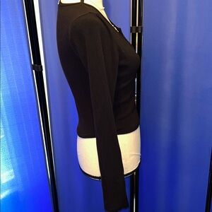 Elegant black V-neck top with long sleeves. Crop fit. Cable-knit design. Comfortable and stylish, a must-have in your wardrobe. Size Large. P2P - 16”. 57% Cotton; 38% Polyester; 5% Spandex.