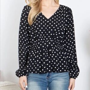 Beautiful long-sleeved v-neck blouse with polka dots and elastic waist detail. 100% polyester