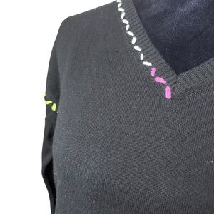 Black V-Neck Sweater with Neon Whip Stitch Trim | 100% Cotton | Sz S
