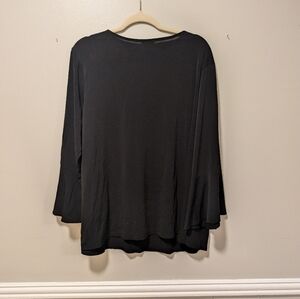 Elegant black V-neck top with flowing sleeves, perfect for any occasion.