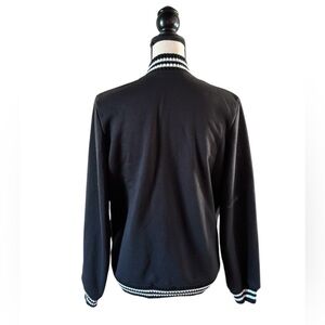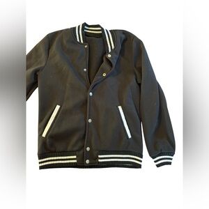 Stylish black varsity jacket featuring white trim. Perfect for casual wear.