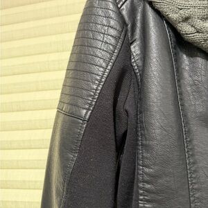 Stylish black vegan jacket featuring a gray knit hood. Perfect for a casual look.