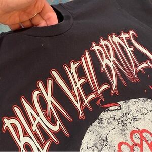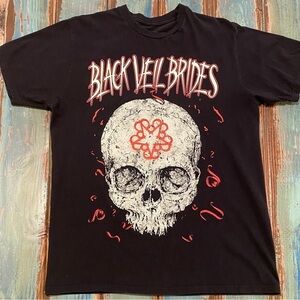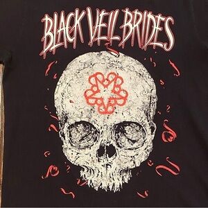 Black Veil Brides T Shirt, Skull, Logo, Black, Measures A Size Medium Mens, Band Tee. Preowned. There is a tiny hole under the front collar, otherwise it’s in good condition. Underarm to underarm measures approx 21” across. There is no tag, so I am sizing it a medium according to the measurement. This t shirt has a great skull graphic and band logo on the front.