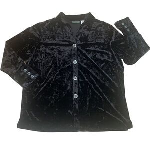 Harve Benard Black Velvet Button Front Long Sleeve Collared Tunic Jacket Size 2X. Gorgeous and in excellent condition. Shell buttons on front and cuffs. Soft and flowing crushed velvet. Side vented slits. Perfect for any occasion.