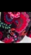 Vibrant, colorful jacket with one clasp in front to close. Mandarin collar, paisley and floral print. Red, green, black, magenta, blue.