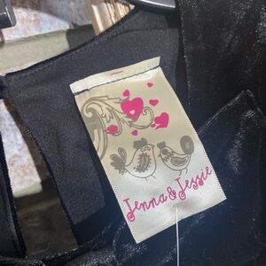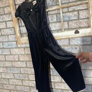 This is a Jenna & Jessie girls’ black velvet jumpsuit that has a sweet, dressy look. It features: