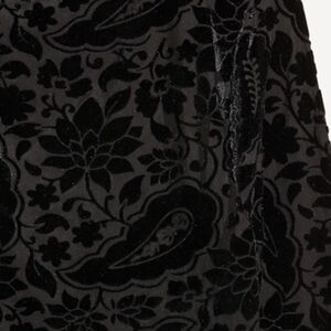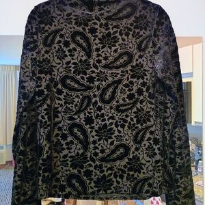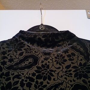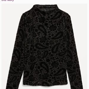 This elegant black velvet top has a sheer with a velvet partern. q I like it because it has long sleeves and it has a mock neck, which allows for a a little sex appeal. This top is also perfect for layering or wearing under a blazer, for a business meeting! It is extremely versatile and it's perfect for going from a day to night look. It is from Old Navy and it is new without tags attached. The size is a medium and it does fit true to size. It does have a stretch to it however, it is form fitting as well. It retails for $26.