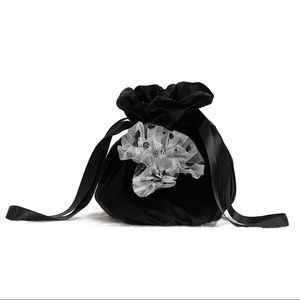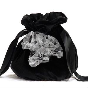 Don't let your handbag ruin your costume! You need one that matches your look. Store your essentials in this adorable bag! It features a black velvet cinch style with black drawstring handle ties and a white and black polka dot bow on the front. New in manufacturer's original packaging!