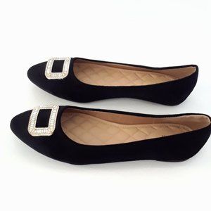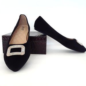 Black Velvet Rhinestone Buckle Pointed Toe Ballet Flats