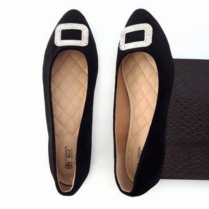 Features a closed, pointed toe. Rose gold tone buckle, with clear rhinestone crystal embellishment. Silky smooth, black velvet upper. Traction on the sole. Quilted, cushioned footbed for the most comfortable walk.