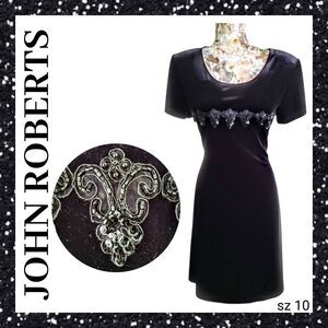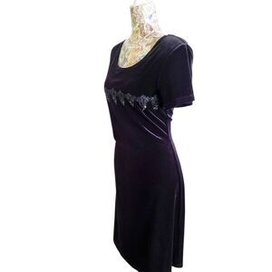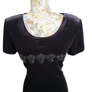 Black Velvet Sequin & Bead Embellished Cocktail Dress Upscale Designer sz 10 in EXCELLENT like NEW Condition! Soft and stretchy easy elegant style perfect for any evening formal event cruise wedding Holiday Christmas cocktail party Dance date night ect! See photos for details and approximate measurements.
