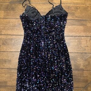 Black velvet sequin triangle top mini dress. Perfect for a special event such as a dance or NYE. Quite a short length. Size small. Brand Crystal Doll. Only worn once. Sequins change between colors of purple/blue/green.