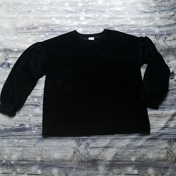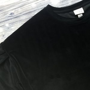 a new day Black velvet like material dress/ casual top. This top is so warm and soft ! It has beautiful tapered liked sleeves at the shoulders. This top is brand new without the tags I bought it tried it on and then just never wore it. Size L
