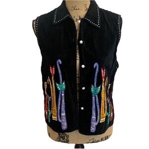 Black Velvet Vest Embroidered Cats on with Pearl Buttons Size S