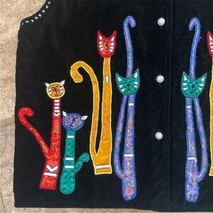 Colorful Embroidered Cats on Black Velvet Vest with Pearl Buttons Size S. Whimsical and fun in good worn condition. Visible wear on the white stitching on the back armpit area as shown.