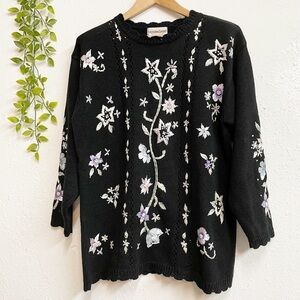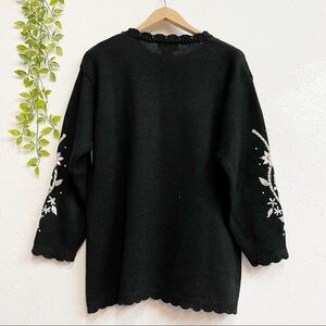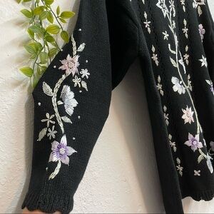 Embroidered with pale pink and purple flowers accented with faux pearls. Design extends onto sleeves as well. Scalloped edges borders the hem, sleeves and neckline. There are a few stray threads that can be trimmed.