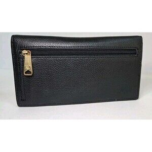 This Black Vintage Ralph Lauren Leather Bi Fold Wallet features elegant gold tone accents, giving it an air of sophistication. The wallet is made of leather with a solid color design, making it a stylish accessory for any woman. With a zipper and snap closure, it provides convenient access to your cards and cash. Its vintage appeal and 90s theme add a touch of nostalgia to your outfit, making it a versatile piece for any city-inspired look. Shows signs of normal usage and wear for age. Size closed is 4" x 7"