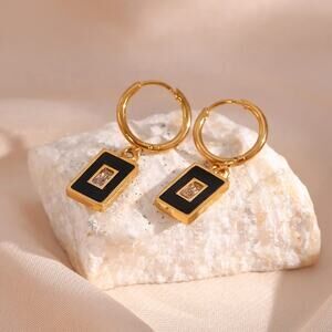 Make a statement with our Black Vintage Style Acrylic Pendant Earrings. These modern and elegant earrings feature a rectangle-shaped acrylic pendant hanging from a small 18K gold-plated stainless steel hoop. The pendant is adorned with a sparkling zircon geometric design, adding a touch of sophistication to any outfit.