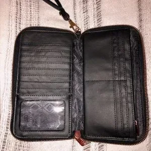 good condition, fits lots of cards! and has a wrist band that can be taken off and on