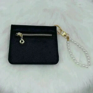 Has a faux pearl keychain strap, unfortunately strap is not elastic or stretchable. It measures 7.2” and is more for like a keychain design or handle but cannot be like a wristlet unless your hand is small enough to fit through the faux pearl keychain strap.