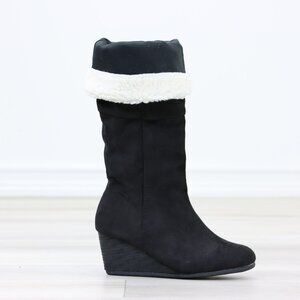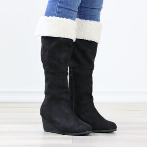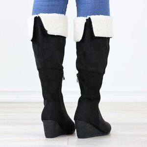 Black Wedge Heeled Boots Sherpa Fold Over Below The Knee Faux Suede