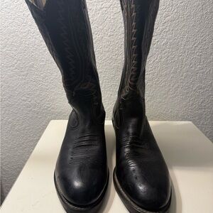 Stylish black cowboy boots with intricate stitching. Perfect for a classic Western look.