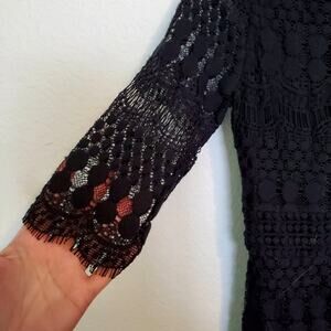 This stunning black whimsigoth sheath dress is brand new with tags! It features crochet lace detailing, a mesh overlay, and a trendy fringe hem.