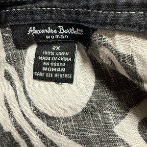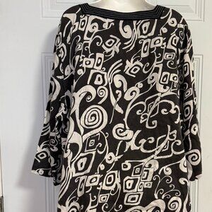 Make a bold style statement with this eye-catching black and white abstract print blouse. Designed with a square neckline framed by contrasting trim, this tunic top features a relaxed, oversized silhouette that drapes beautifully. Its flowing sleeves and unique allover swirl and geometric print make it both comfortable and stylish.