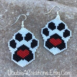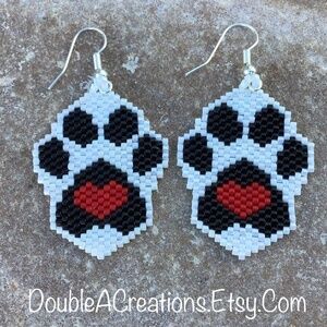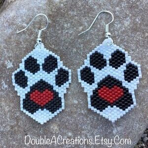 Here’s a pair of Black, White and Red Puppy Love Heart Earrings that are lightweight and comfortable to wear all day long. Made with high quality glass Delica Beads, beaded one bead at a time. Love and passion goes into making my jewelry. This process requires focus, patience and dedication. Each bead is 16th of an inch and can take hours to complete a project.