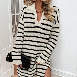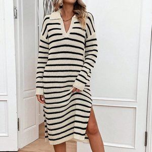 Black & White Boho Womens Stripe Pattern Drop Shoulder Split Thigh Sweater Dress