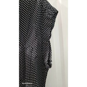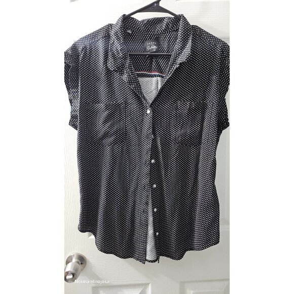 Black & White Button-Up Blouse with Heart Print Short Sleeves Rayon Material