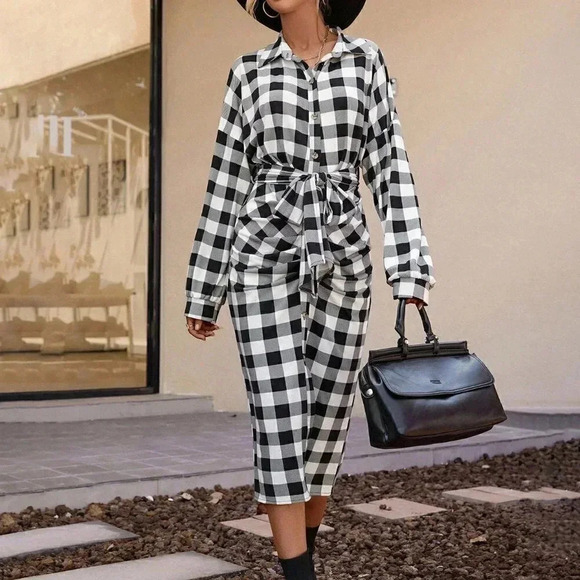 Black & White Casual Womens Gingham Drop Shoulder Ruched Belted Shirt Dress