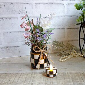 Small checked vase with black and white checkered pattern filled with vintage faux wildflowers, hand cut filler and twigs from nature accompanied by a small checked tea light candle with on/off switch and replaceable battery compartment. A beautiful and unique set to add to your checked courtly collection or give as a gift to that checked collector in your circle. Hand designed one of a kind piece that brings a bit of the outdoor country in to you! vase is approx. 3 x 2.5 inches; total arrangement height is 8 inches., weight approx. 6 oz